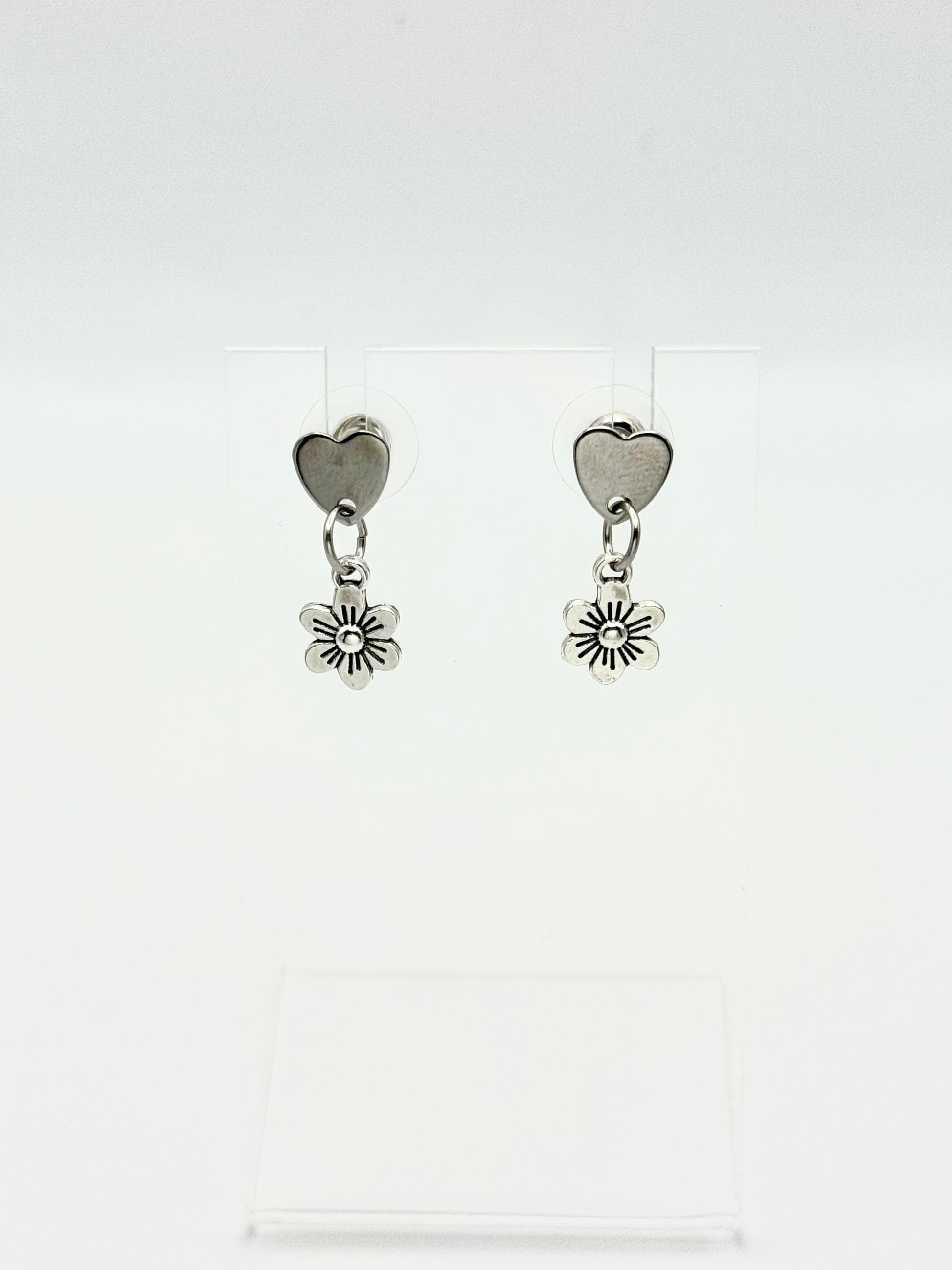 Description: Simple silver daisy charms dangle from heart studs, offering a light and delicate accessory for everyday wear. A sweet reminder that beauty can be found in life’s simplest details.