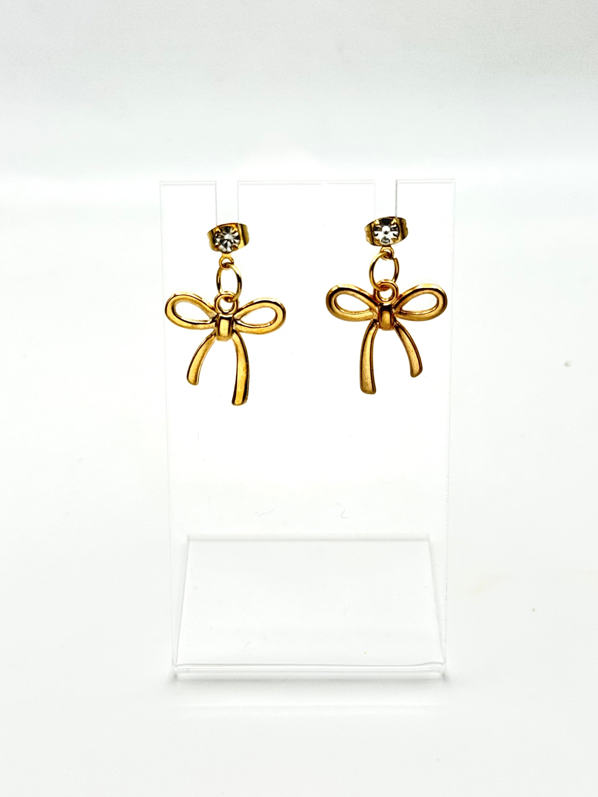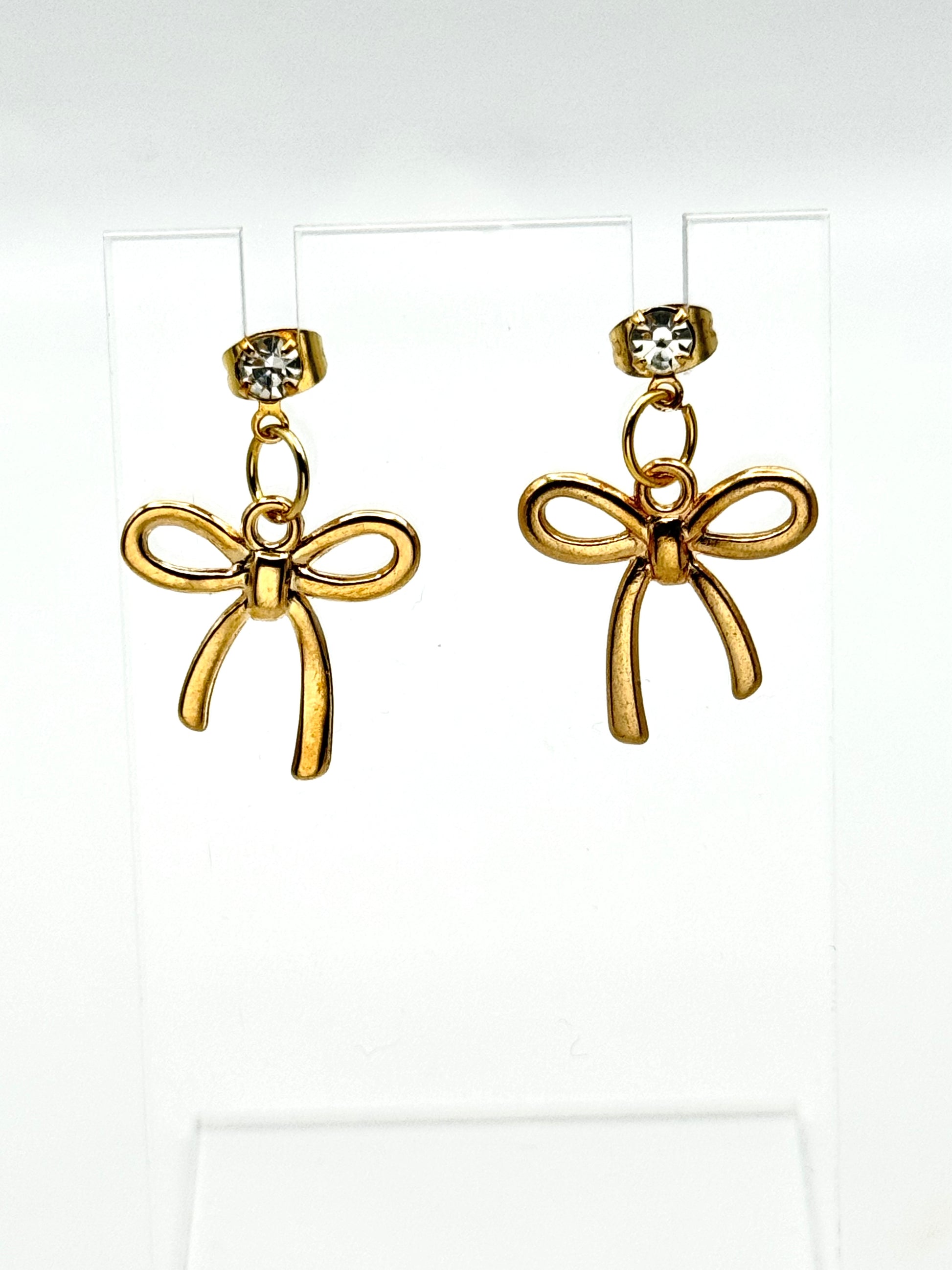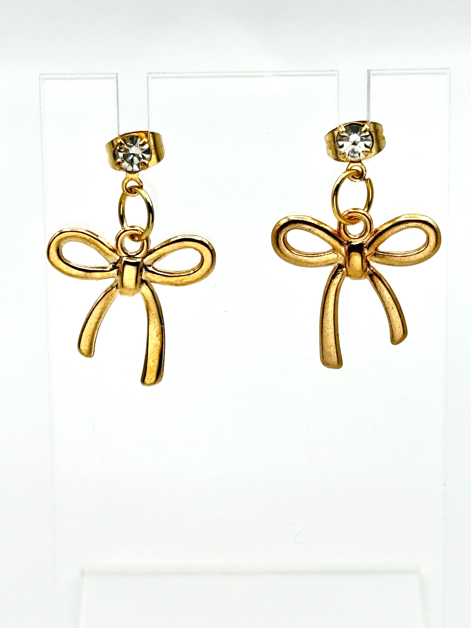 Description: Sleek golden bows hang from crystal studs, blending elegance with everyday charm. A lightweight, versatile design that adds just the right touch of sparkle to your style.