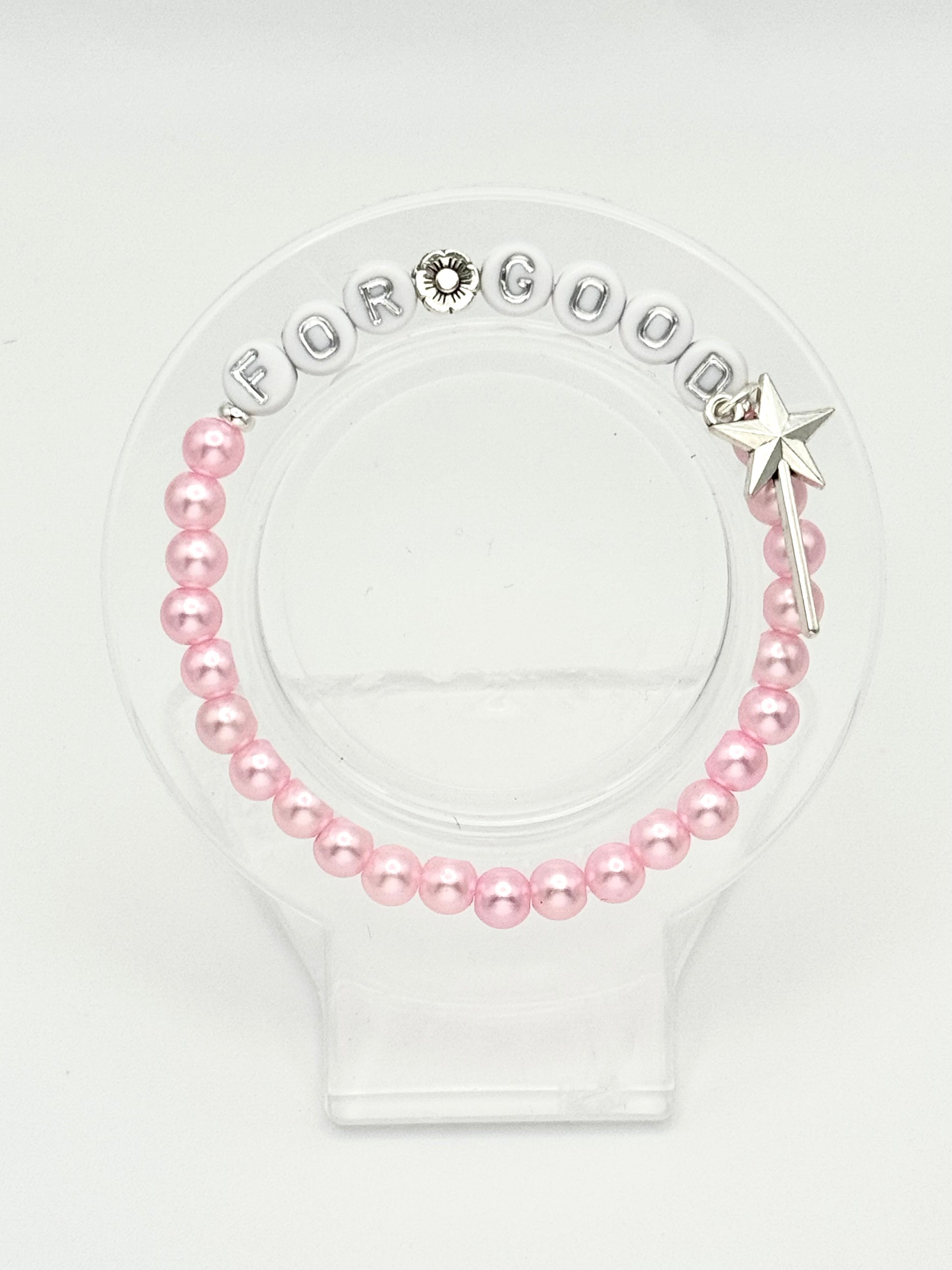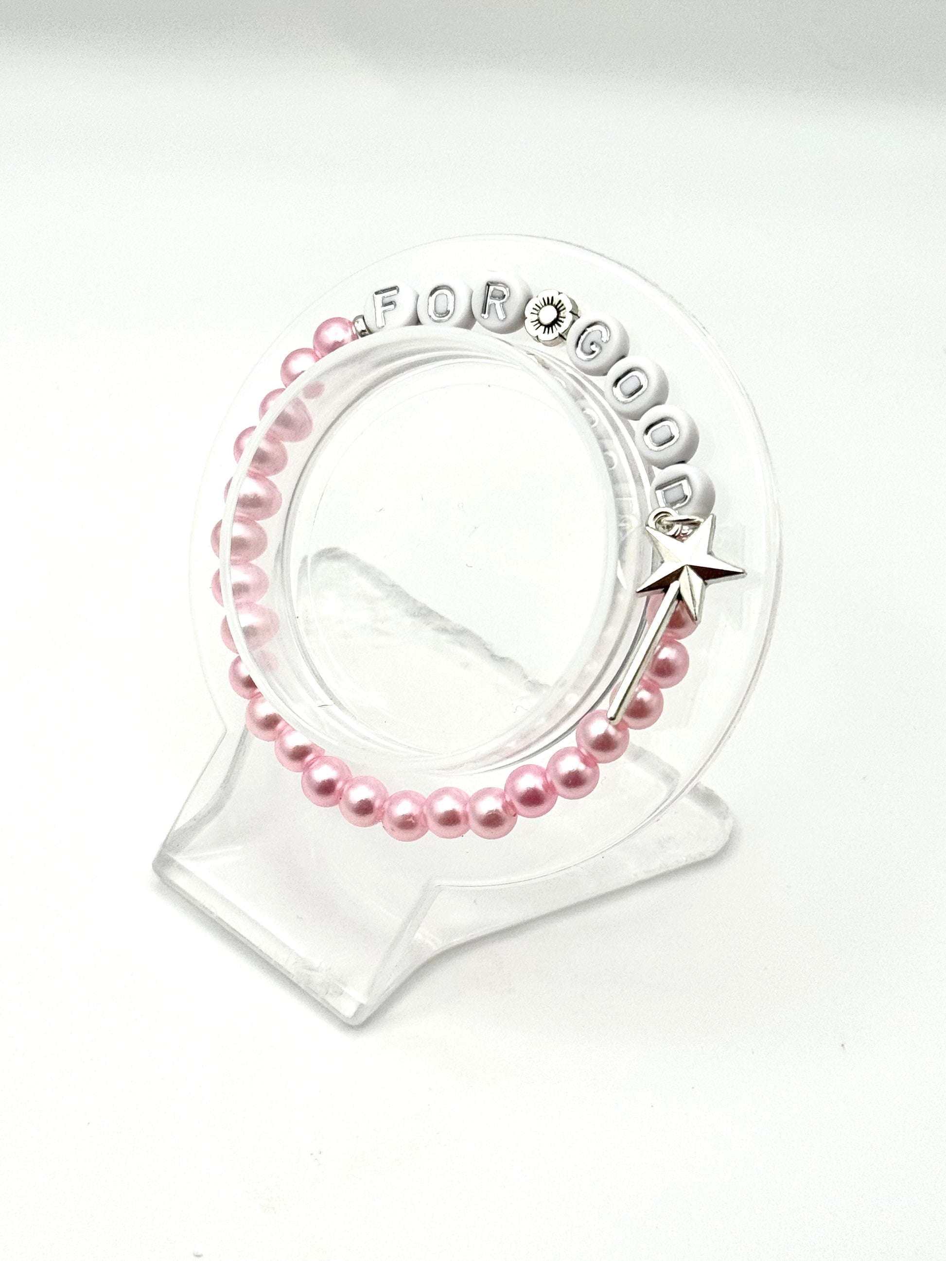 Product Description: Soft pink pearls and white “FOR GOOD” beads accented with a silver wand charm. Elegant and tender, this bracelet embodies empathy, hope, and the magic of choosing grace over perfection.