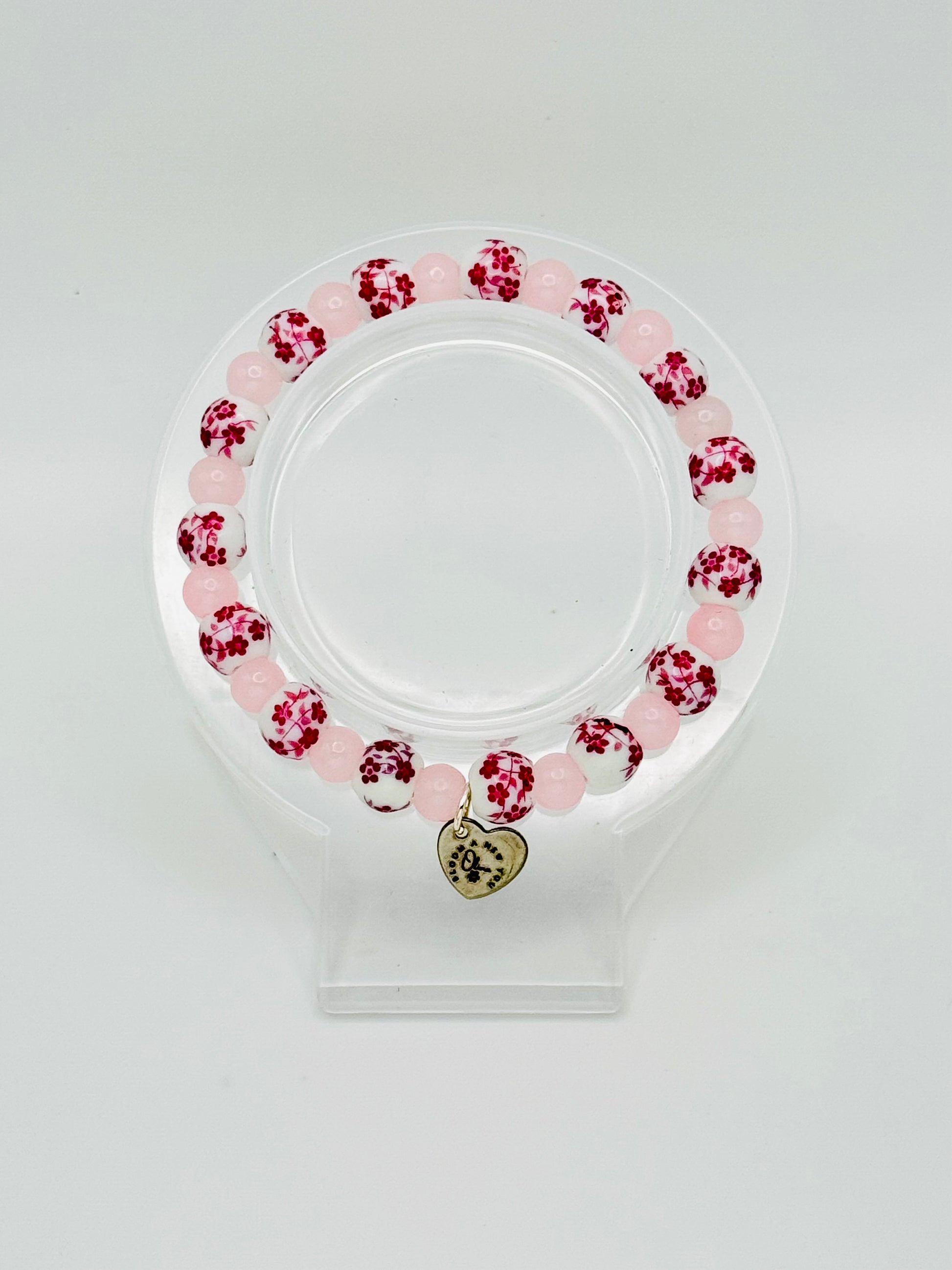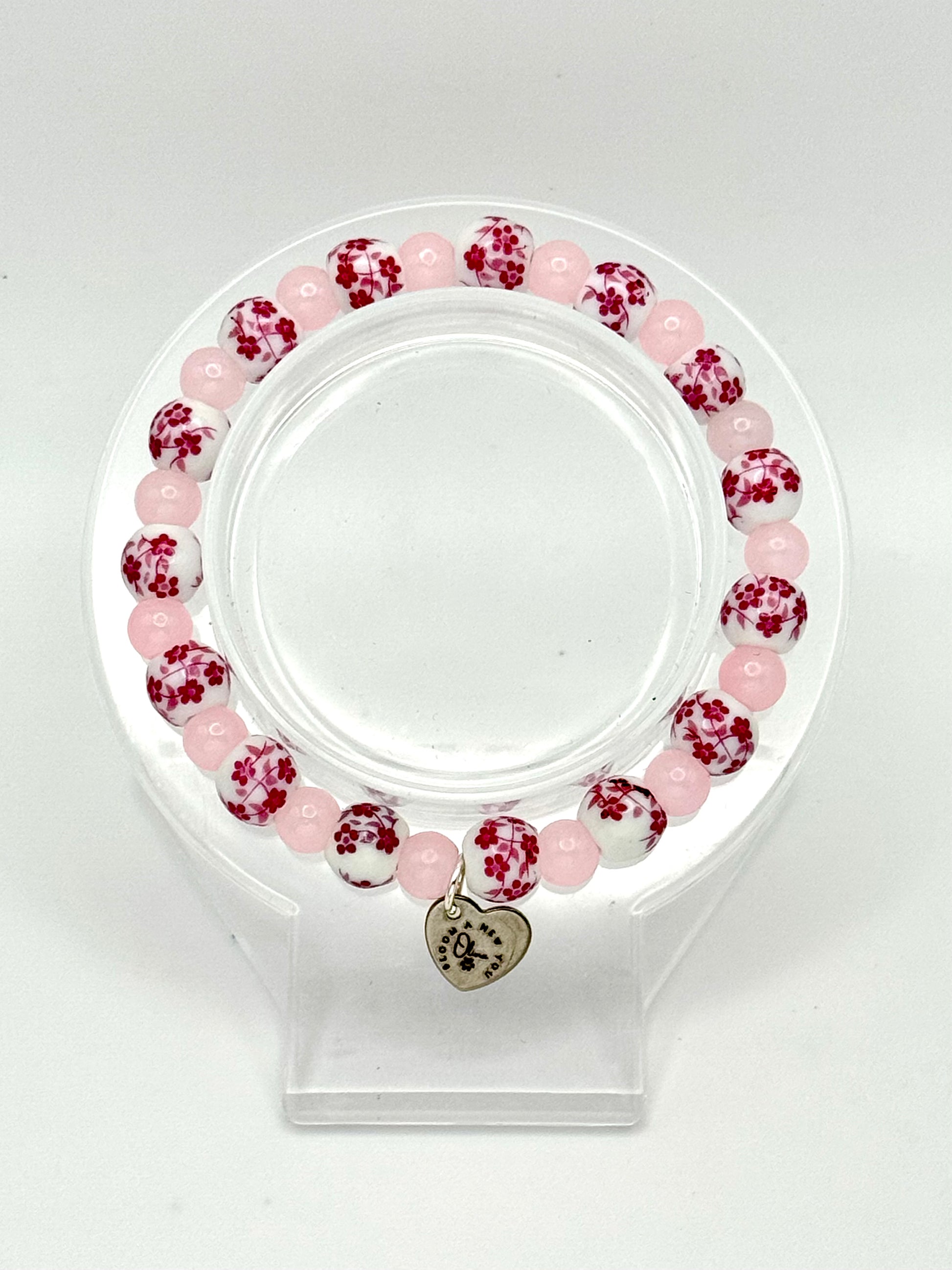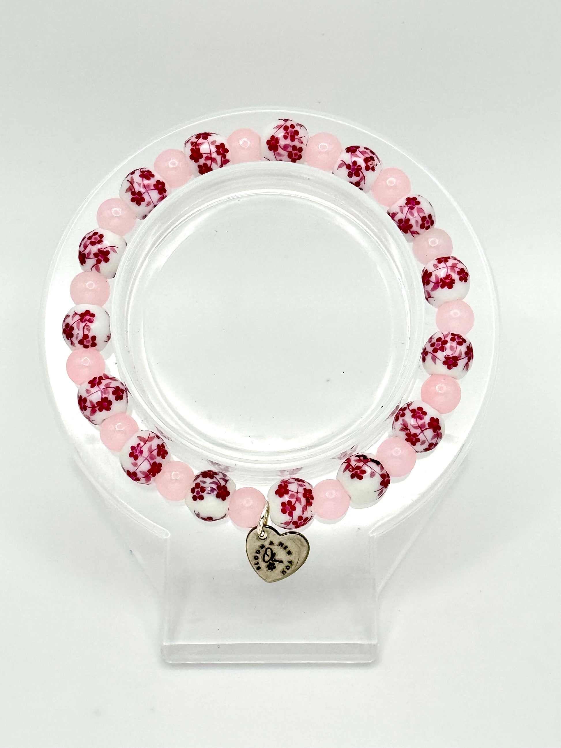 Description: Soft, sweet, and timeless. Blush in Bloom pairs delicate pink glass beads with white porcelain beads adorned in fuchsia florals. Romantic and feminine with a touch of vintage charm, this bracelet is a celebration of gentle beauty and quiet strength. The silver “Bloom A New You” charm adds a subtle reminder that growth can be both powerful and pretty.