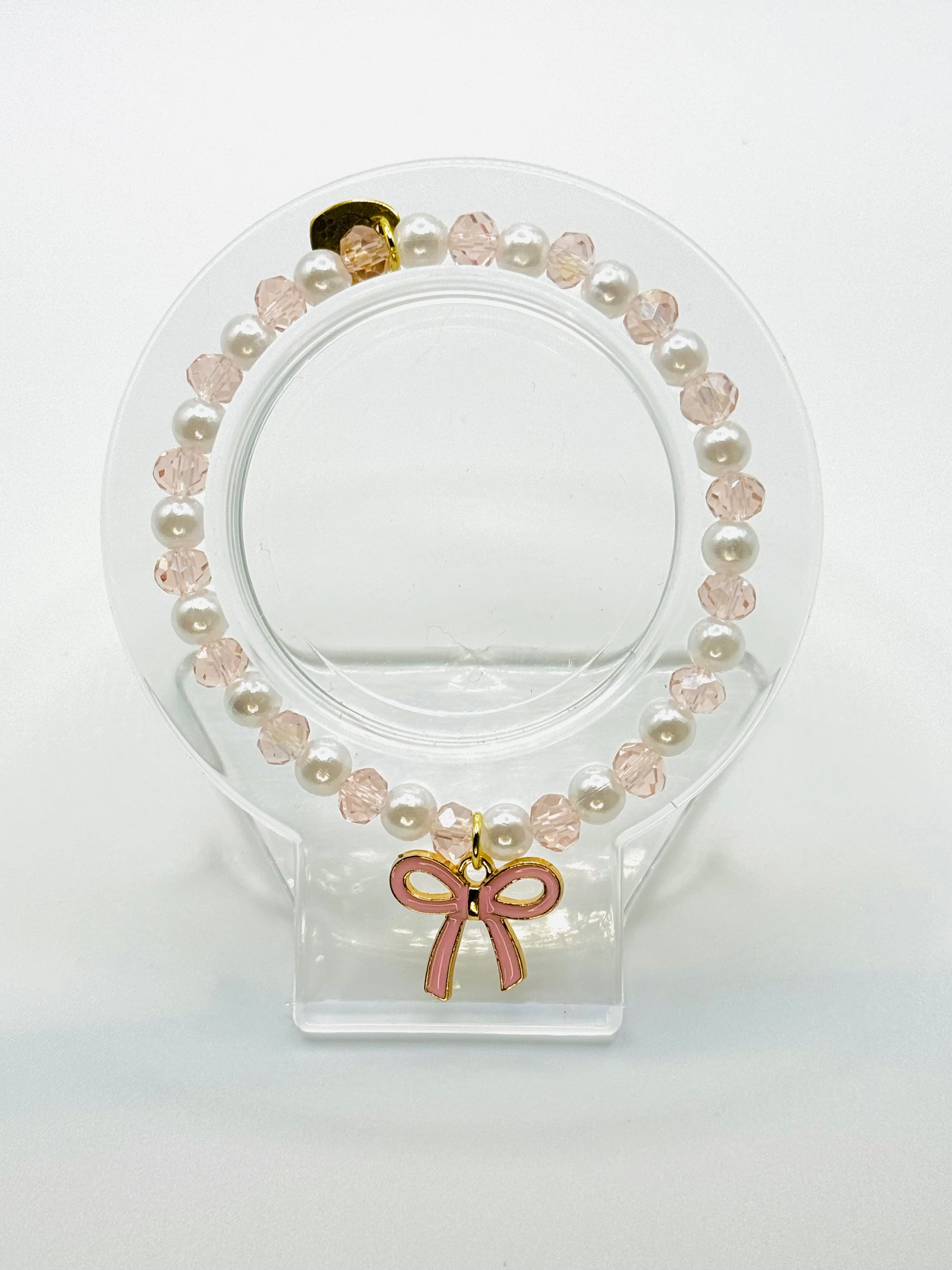 This charming bracelet features a delicate mix of soft pink crystal beads and classic pearls, elegantly alternating to create a graceful design. At the center, a dainty pink enamel bow charm hangs, framed in gold, adding a playful yet sophisticated touch. The combination of pink and pearl exudes a feminine coquette style, perfect for those who love a sweet, romantic look. This bracelet is versatile enough to be worn alone or stacked with others, making it an ideal accessory for any occasion.