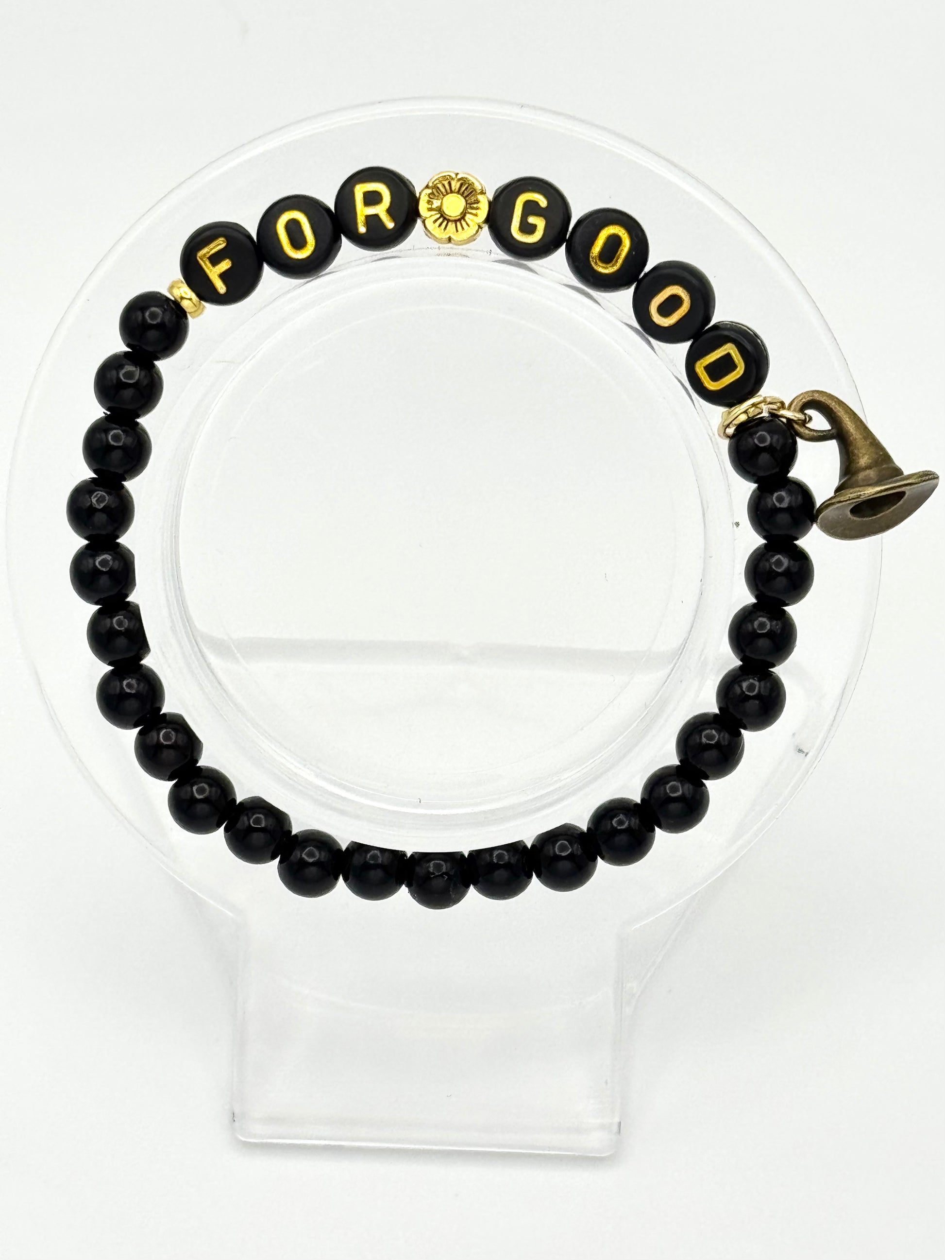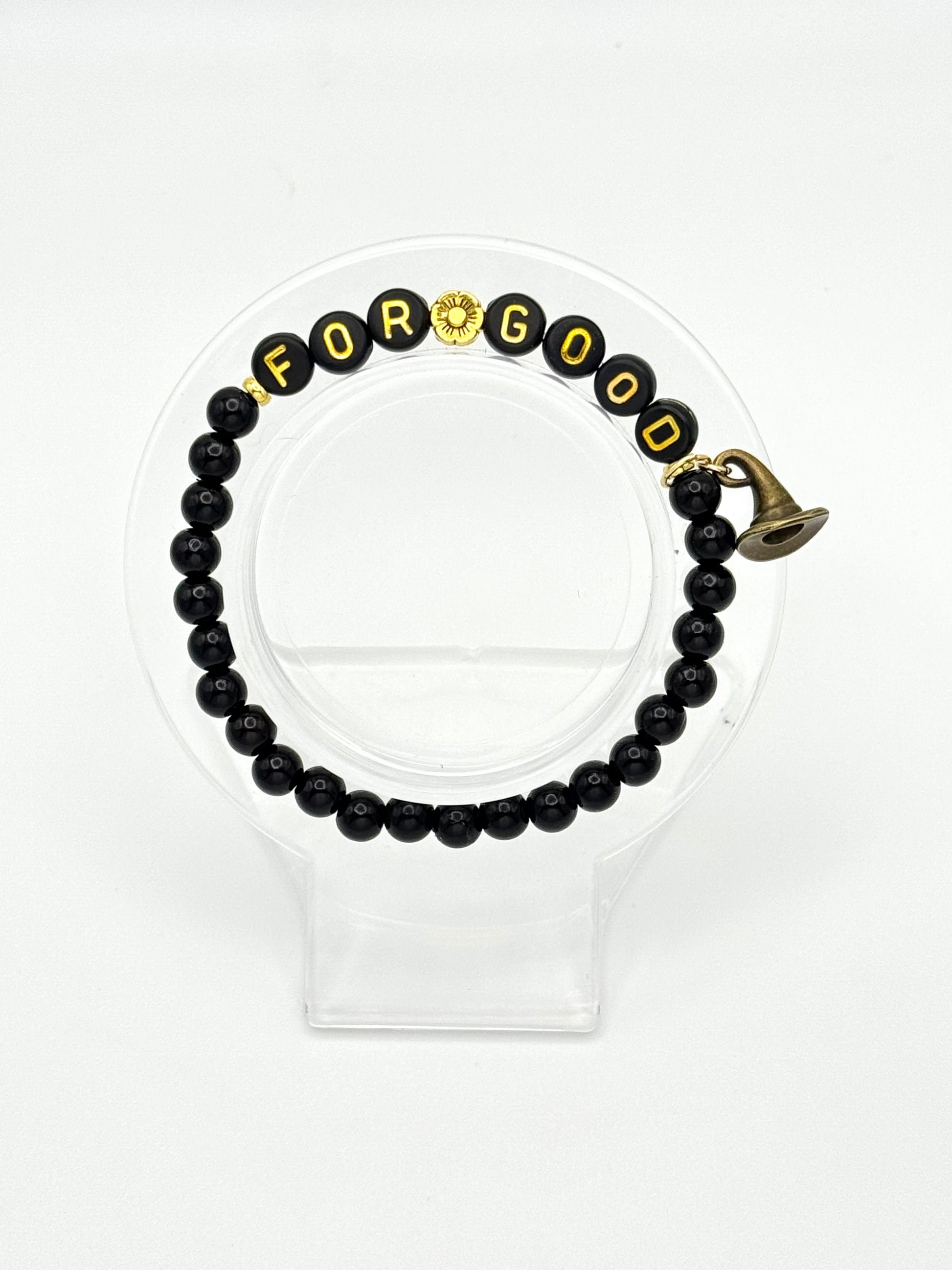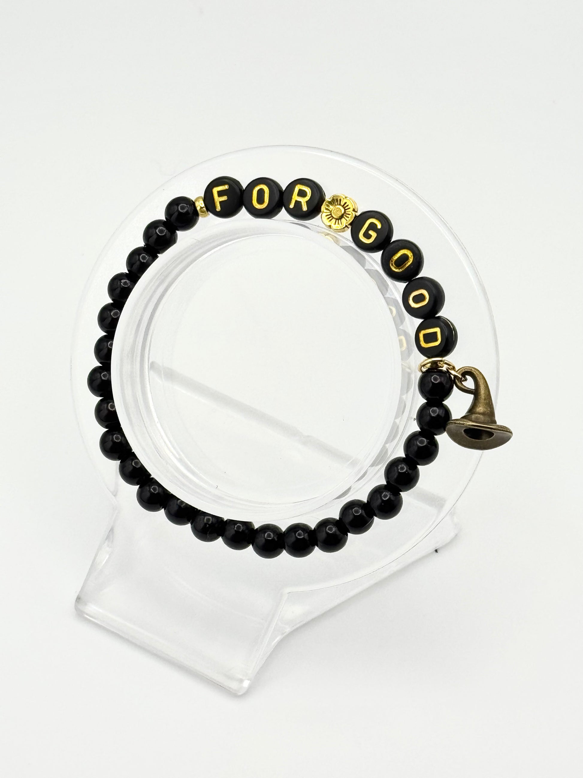 Product Description: Matte black beads paired with gold “FOR GOOD” lettering and her iconic witch hat charm symbolize resilience, authenticity, and the quiet power of staying true to yourself. A reminder that strength isn’t loud; it’s unwavering.