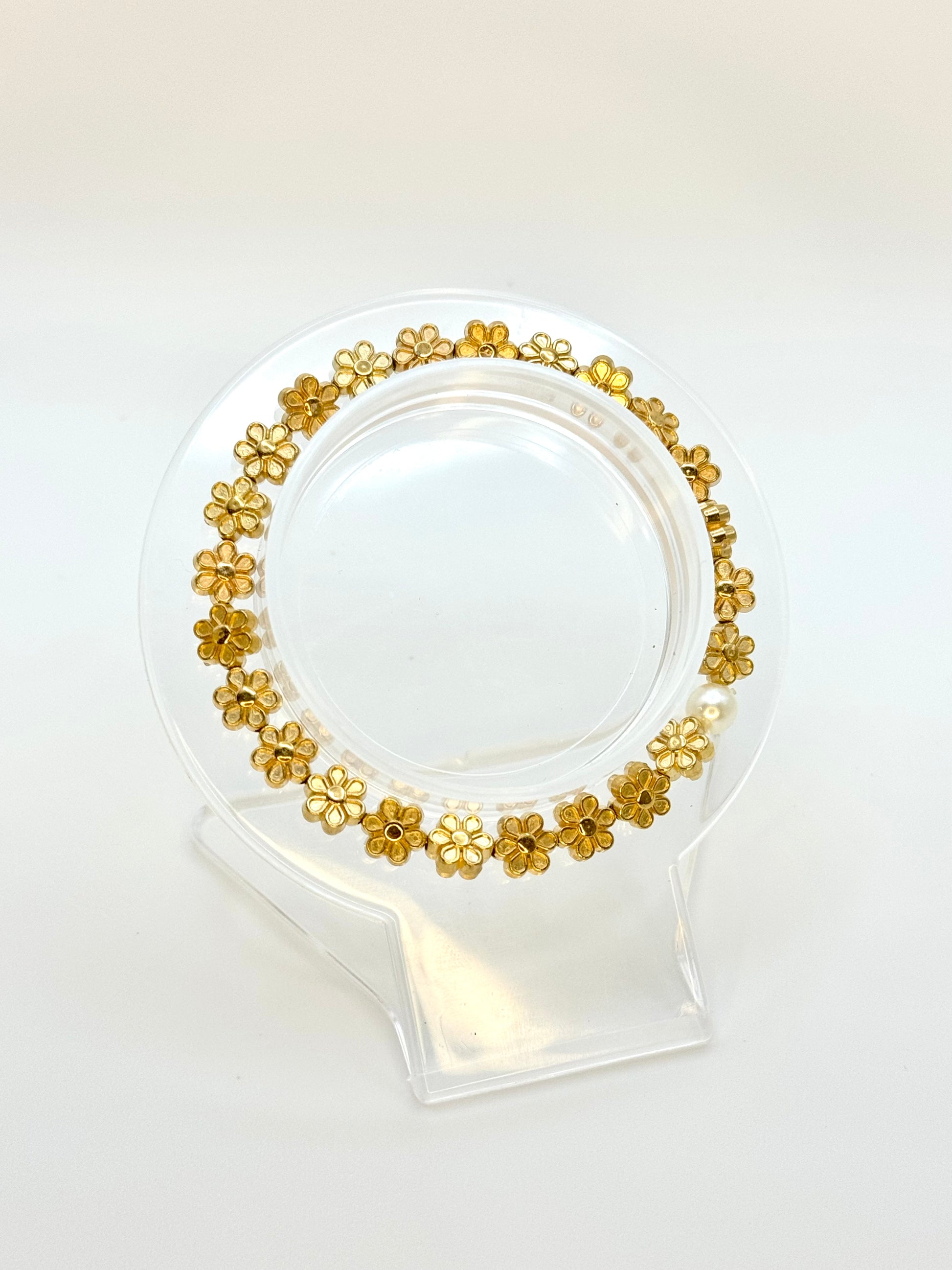 The golden daisies, shining brightly, reflect the warmth and light that Olivia brought into your life, making this bracelet not just a piece of jewelry but a heartfelt tribute to her memory. The intricate detailing of the flowers and the smooth pearl create a harmonious balance, making it a versatile piece that can be worn alone or stacked with other favorites.