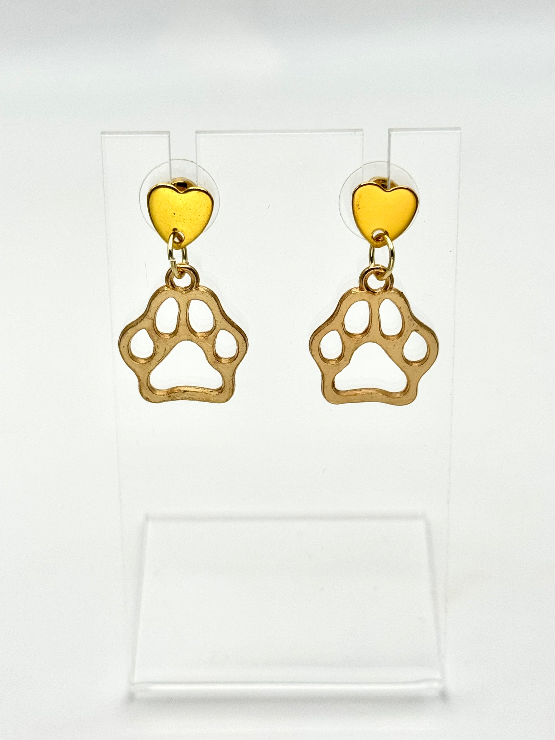 Description: Golden hearts cradle open pawprints in this radiant design, representing the warmth and joy pets bring into our lives. A shining symbol of love, these earrings are perfect for daily wear or as a thoughtful gift.