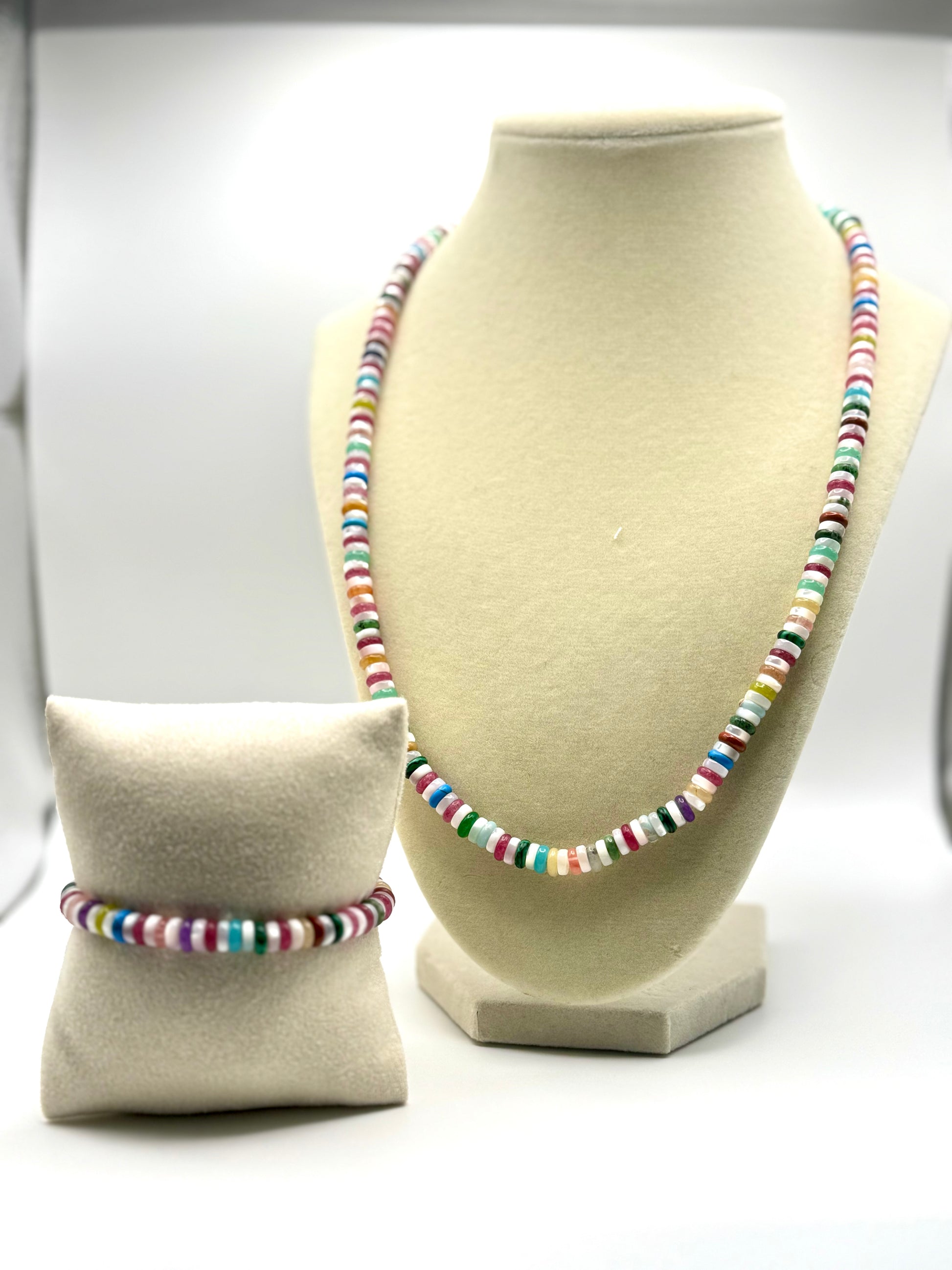 Description: Celebrate the beauty of unity with our Harmony in Color pieces — a vibrant bracelet and matching necklace handcrafted with an array of natural stones and luminous shell beads. Each colorful disc represents the uniqueness of our emotions, memories, and milestones, while the mother-of-pearl anchors the design with a soft, grounding light.
