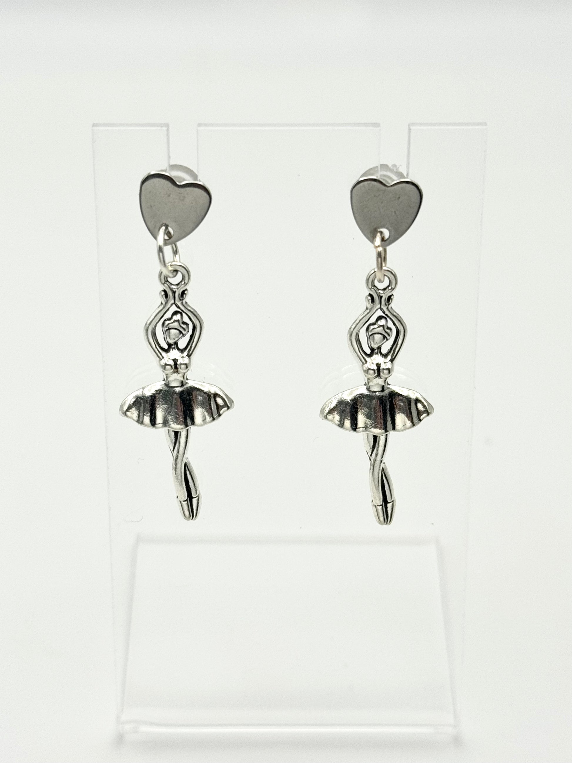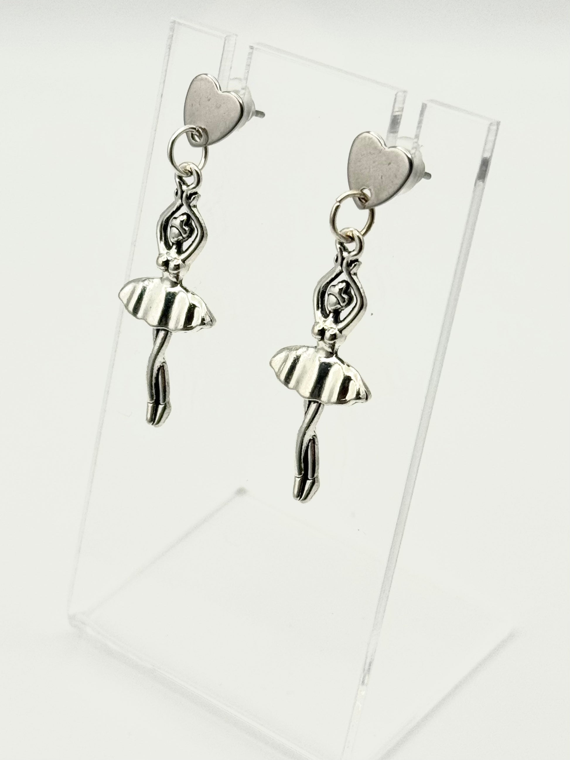 Description: The Heart of a Dancer earrings feature a silver ballerina in an elegant en pointe pose, hanging gently from a silver heart earring post. It’s a piece that honors the love behind every step and the strength that makes each movement beautiful.