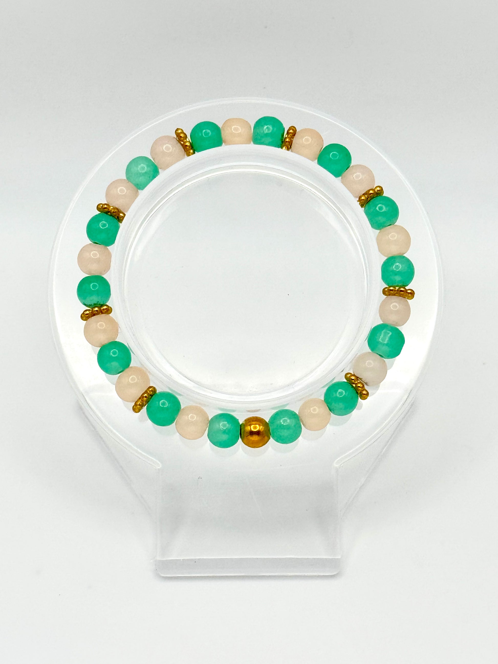 Inspiration: Cool mint green meets soft blush in this fresh and feminine design. Accented with golden touches, this bracelet offers a calming palette that whispers elegance while staying effortlessly wearable.