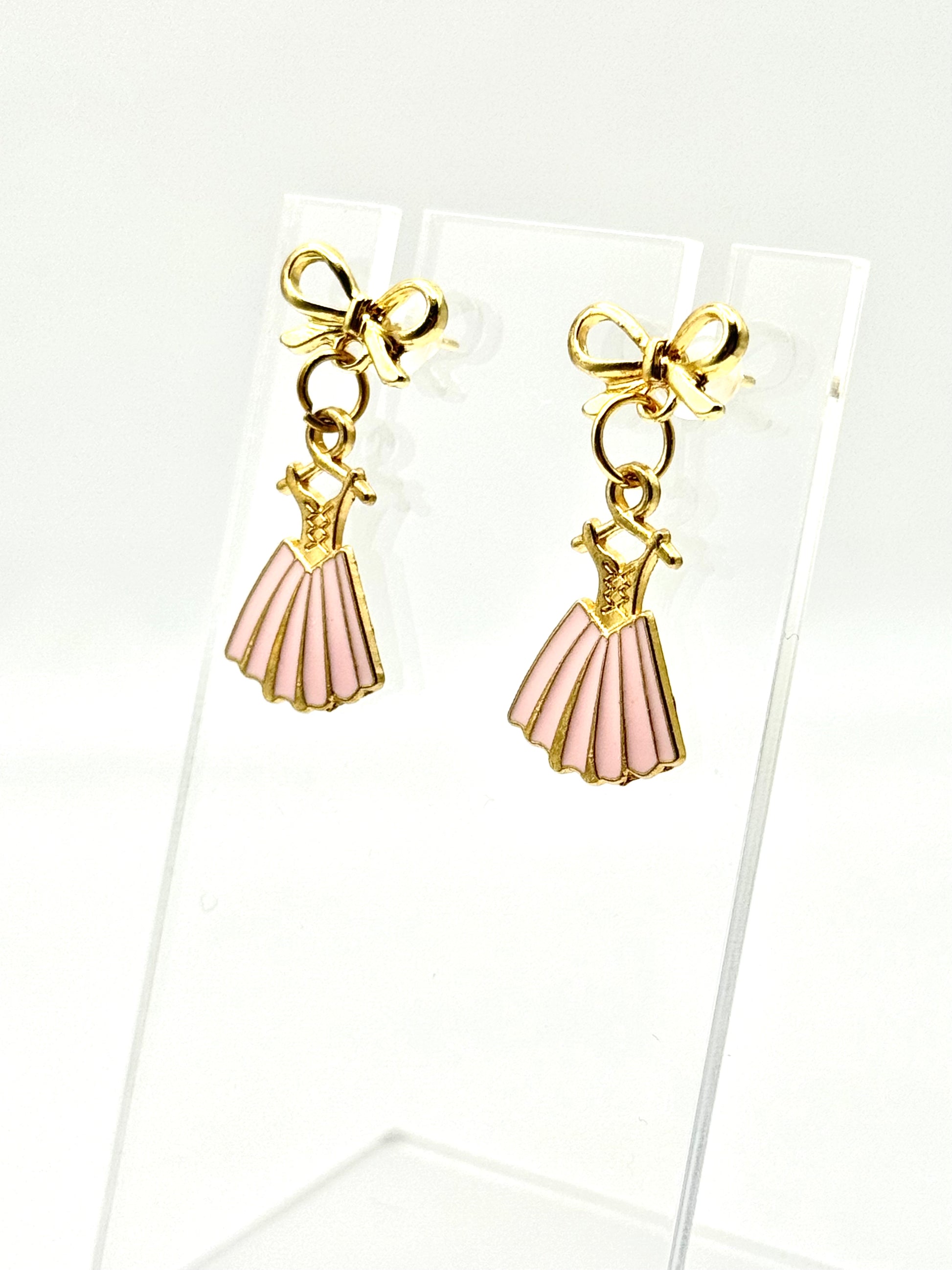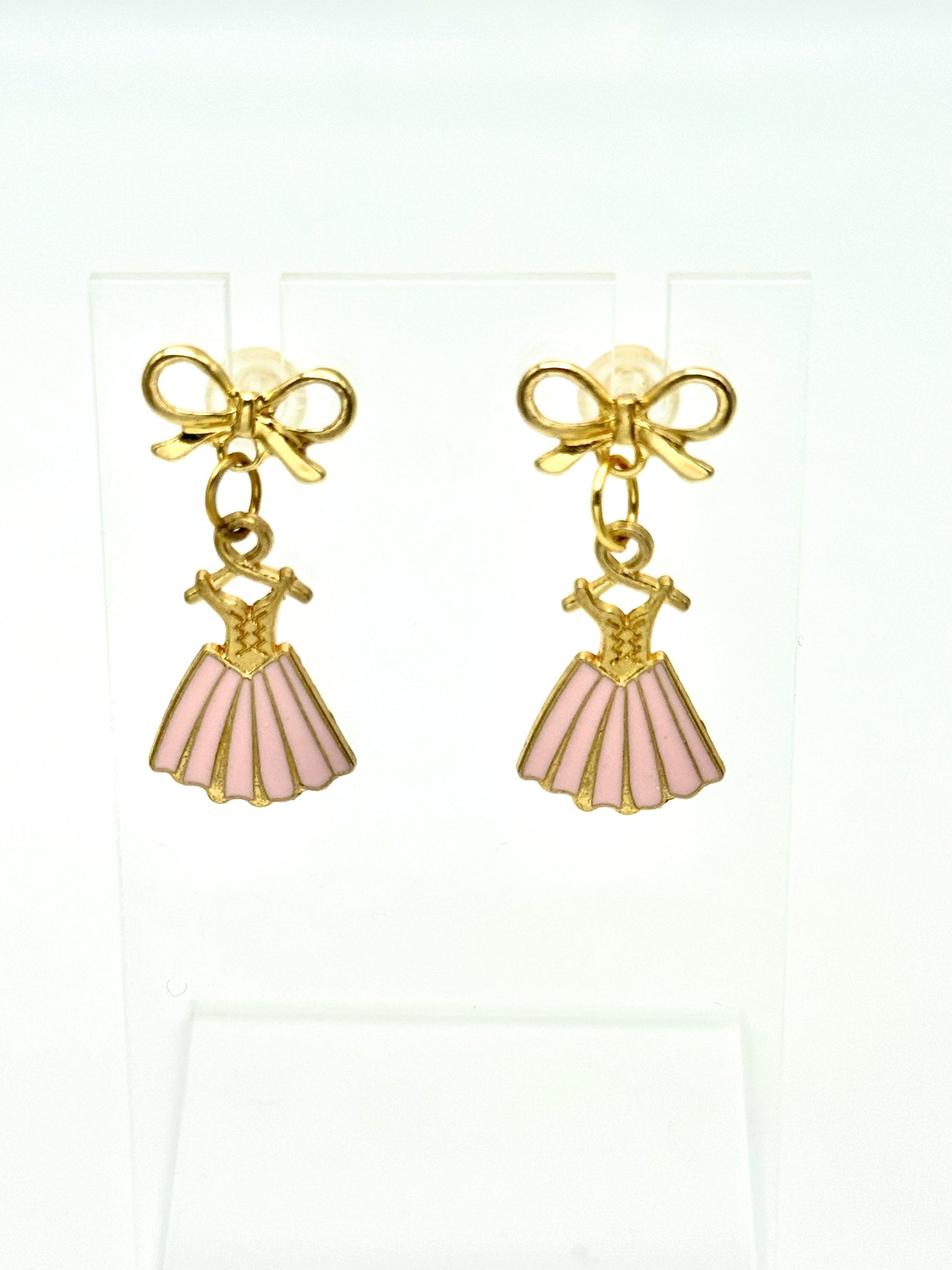 Description:Take a bow, ballerina. These whimsical earrings feature a gold-plated bow post, from which a tiny pink tutu swings gently on a golden hanger—like a costume waiting backstage for its star. Feminine, playful, and full of movement, Prima in Pink is a love letter to every dreamer who’s ever danced in front of a mirror or stepped into the spotlight.