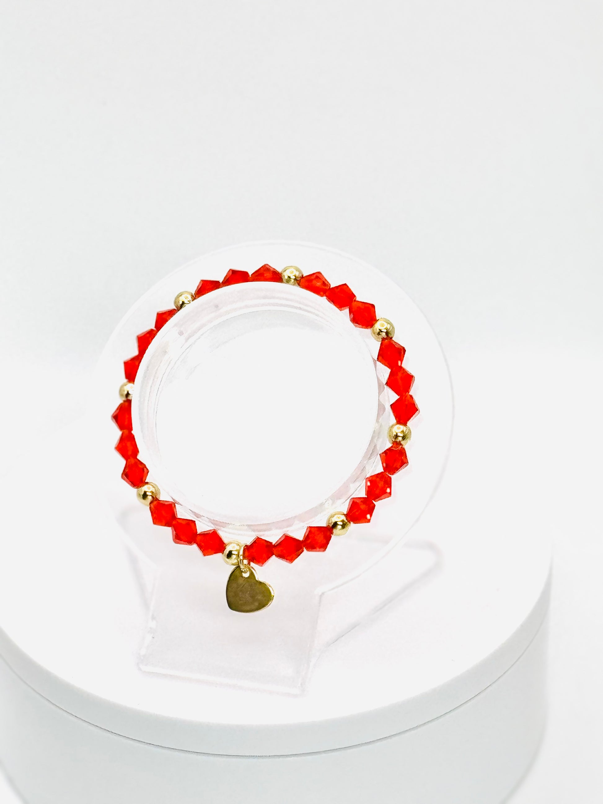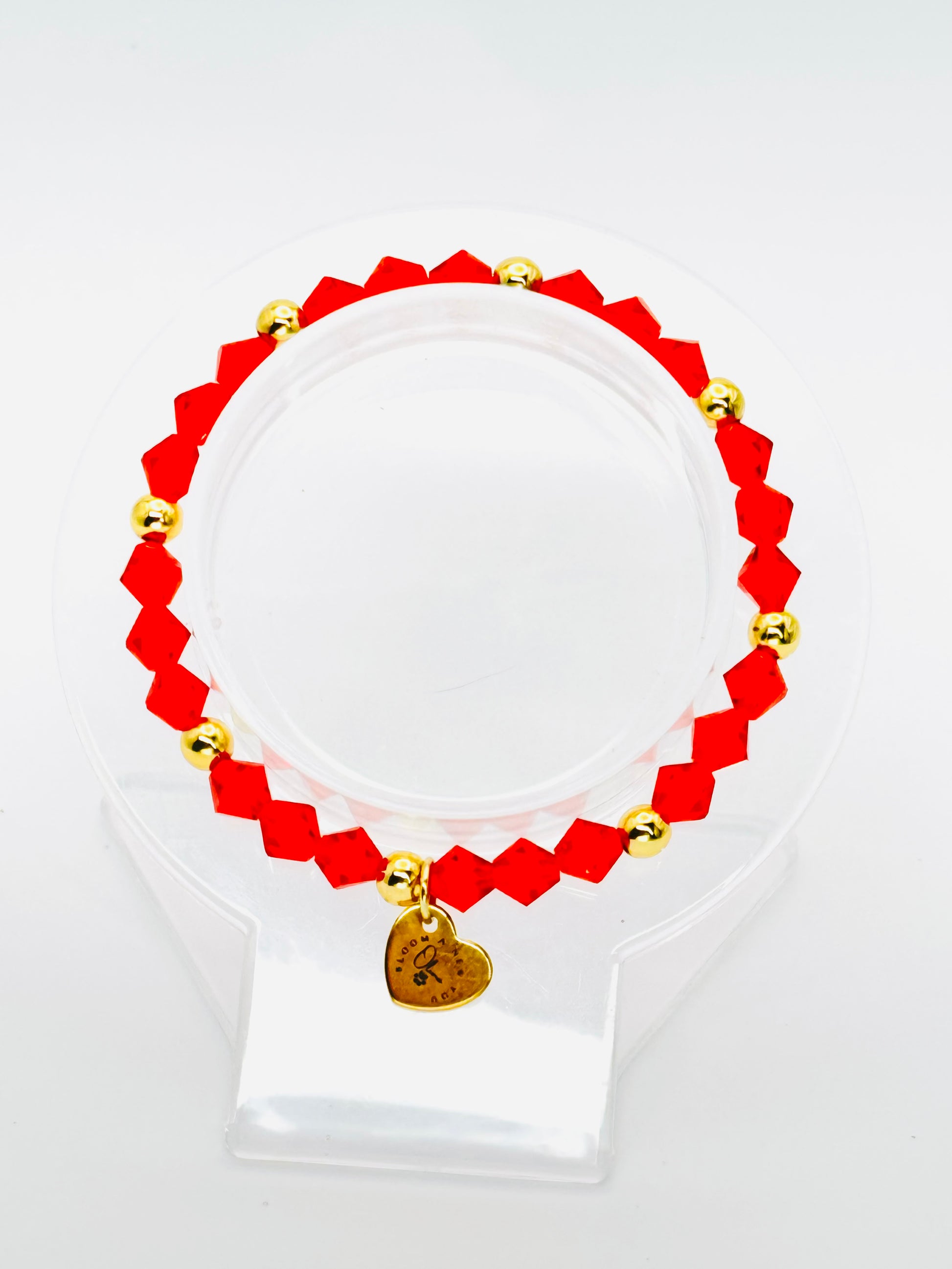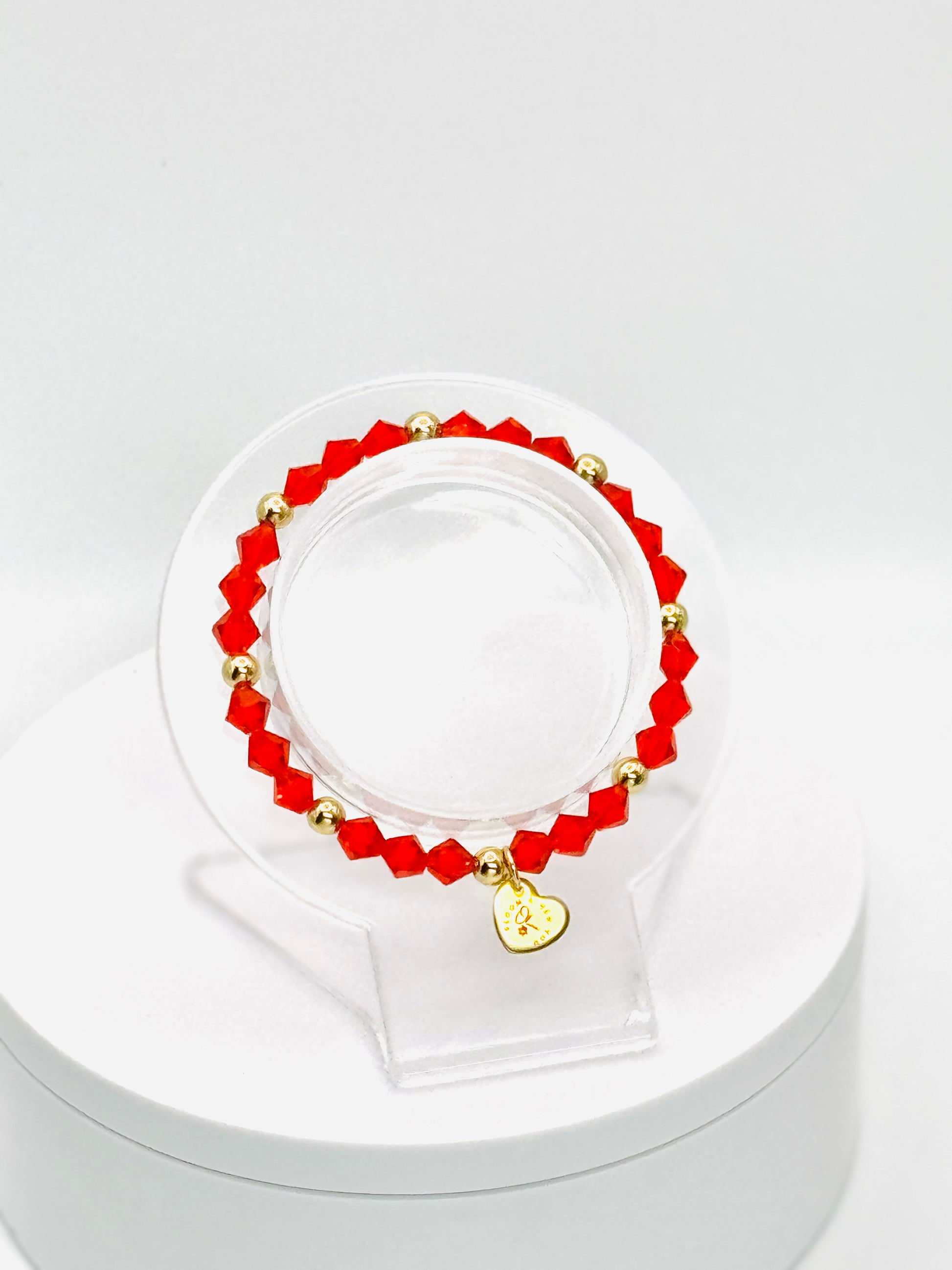 This bracelet is a striking representation of Olivia’s soft and gentle spirit. Made with warm red Swarovski crystals and 14k gold beaded accents, it reflects her delicate personality and love Olivia brought to every moment of life. The heart charm symbolizes the bond she shares with those who continue her legacy, much like the red bow she proudly wore.