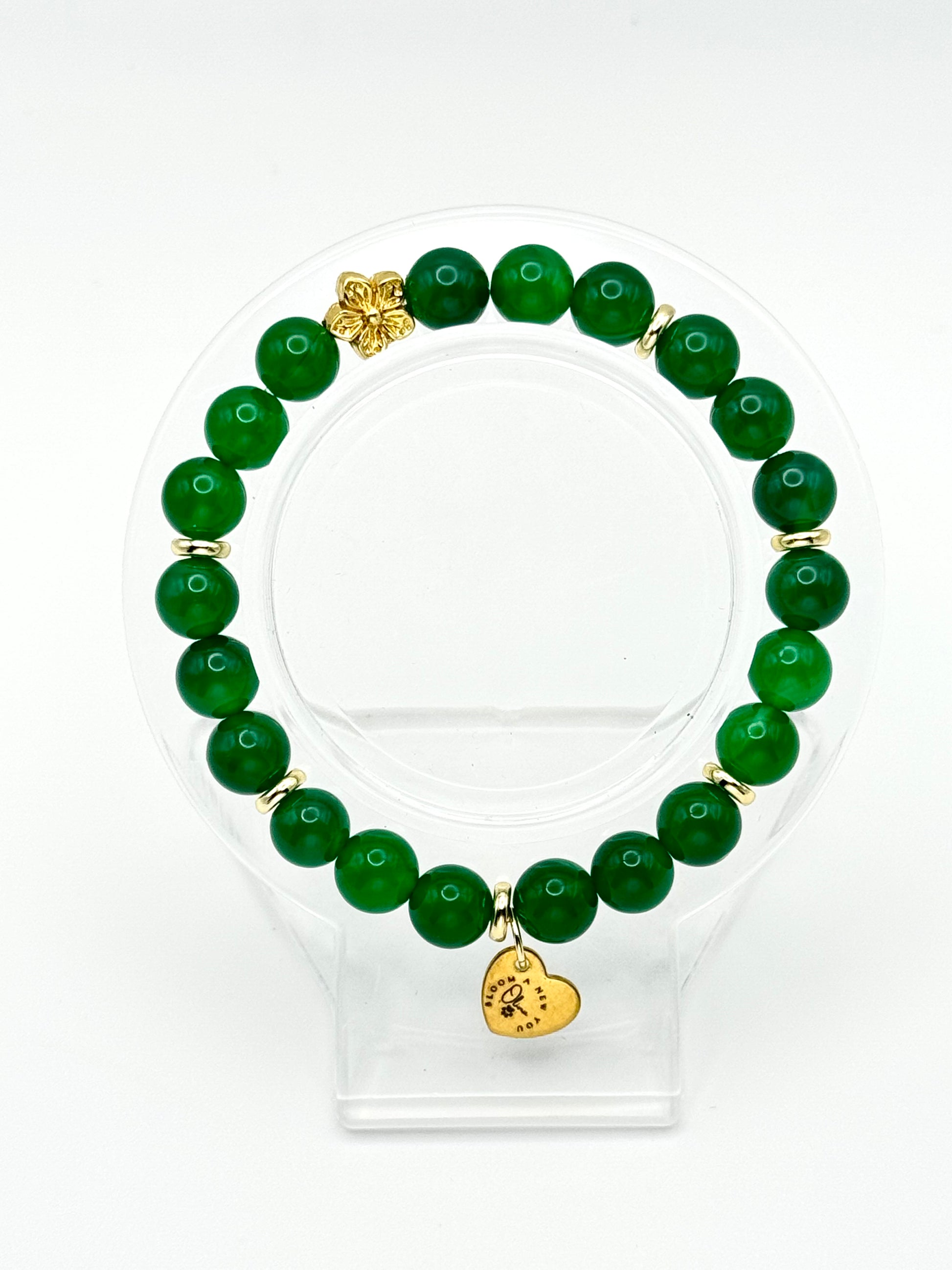 Crafted with polished green agate beads, this bracelet promotes emotional balance and self-confidence. Green agate is known for its grounding energy, helping you stay centered through life’s changes. A golden floral accent symbolizes new beginnings, while the signature Bloom A New You heart charm adds a loving reminder of your journey.