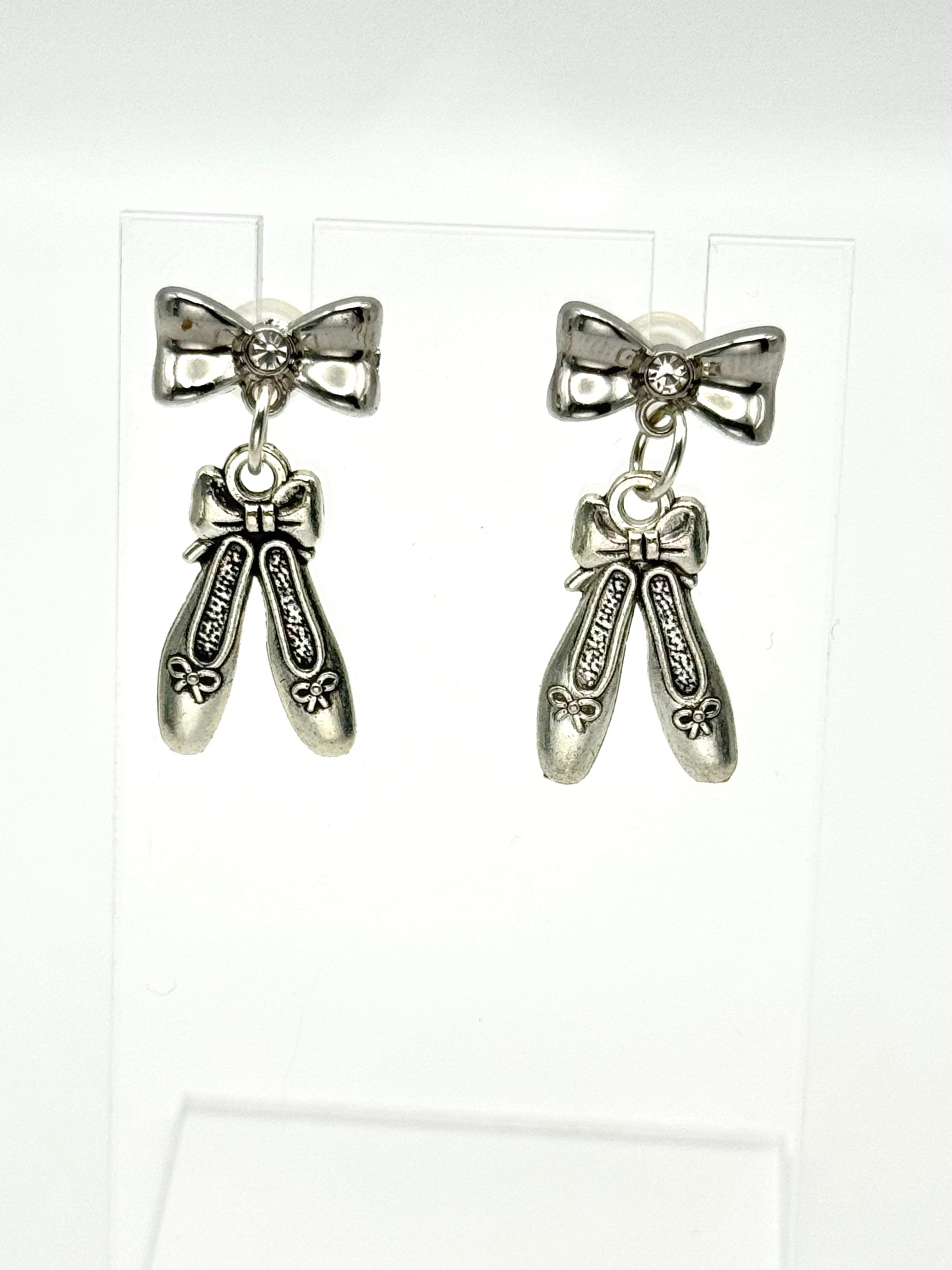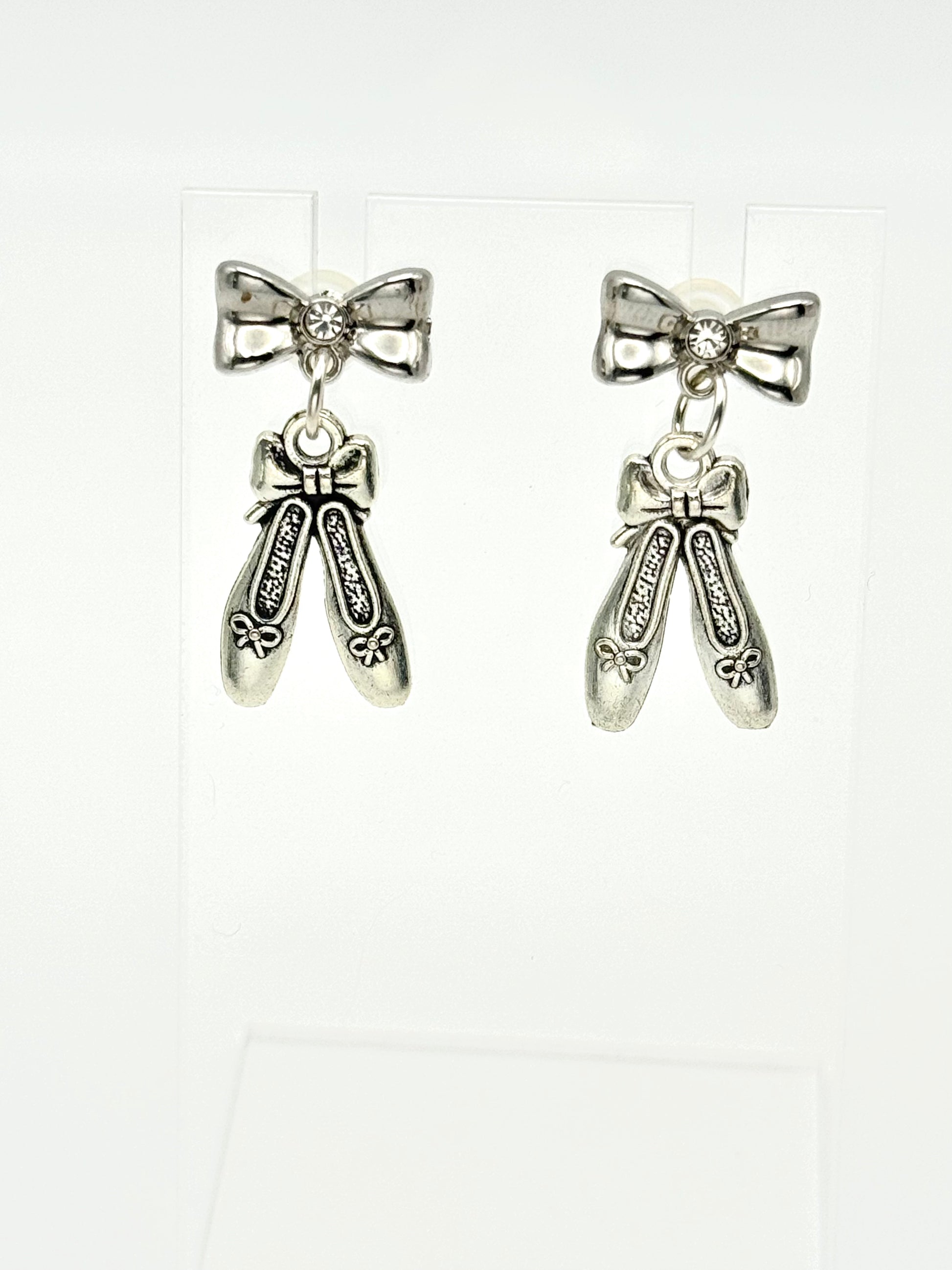 Description: Polished, poised, and full of grace — Silver Slippers captures the quiet elegance of the dancer’s ritual. With a dainty silver bow post and a tiny crystal stud at the center, each earring holds a pair of ballet slippers tied with perfect form.