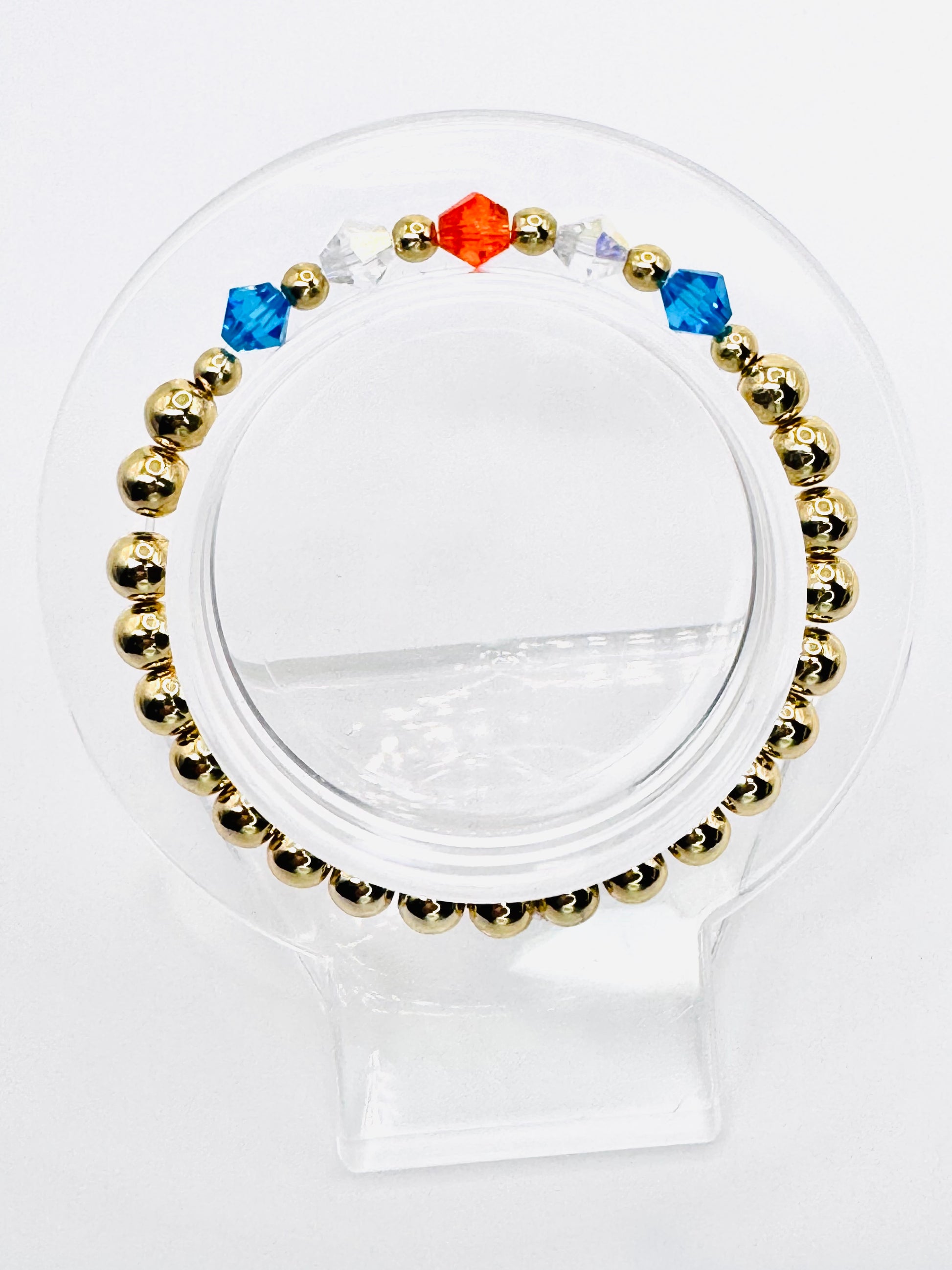 Description: This bracelet uses deep ocean blue and nautical white crystals with gold beads to celebrate a sense of adventure. A hint of yellow represents a playful, fearless character ready for any challenge. The bracelet features our gold heart charm engraved with “Bloom A New You overarching ‘Olivia’,” adding a touch of love and warmth with our lucky number 7 and infinity sign on the back to bring infinite luck, love, comfort, and support to all who wear our bracelets.