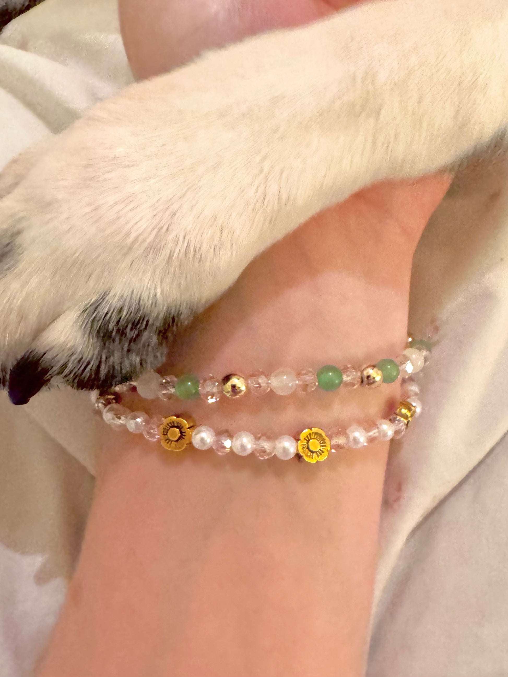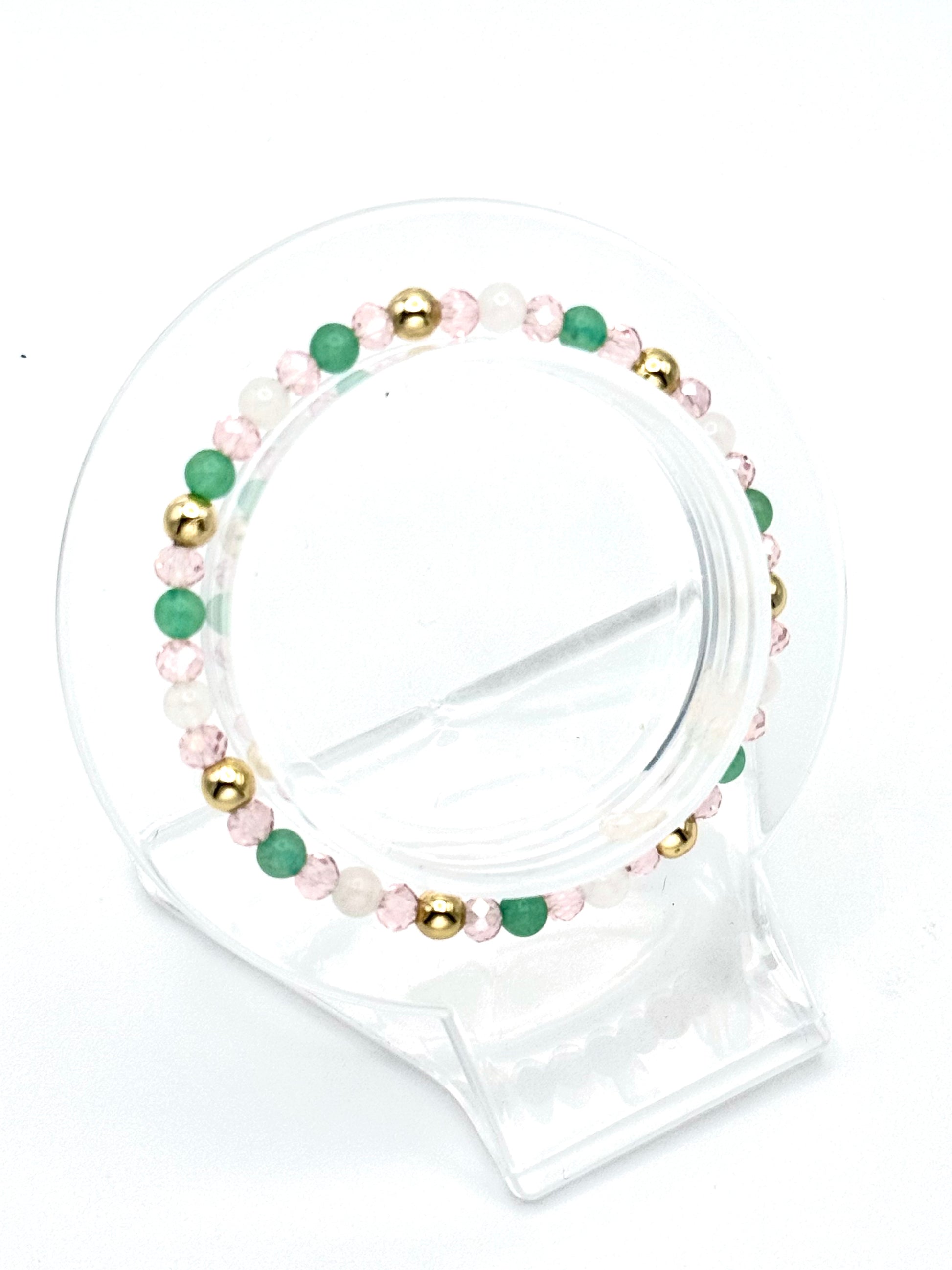 Inspiration: The Olivia’s Blooming Memorial Garden Bracelet was created to honor the love that continues to blossom long after goodbye. White jade brings peace and purity to cherished memories, while green agate symbolizes the ongoing growth of love — both for those we’ve lost and for the person we’re still becoming. Soft blush-pink crystals represent compassion and enduring affection, and golden spacers glimmer like sunlight through petals — reminders that love’s warmth remains.