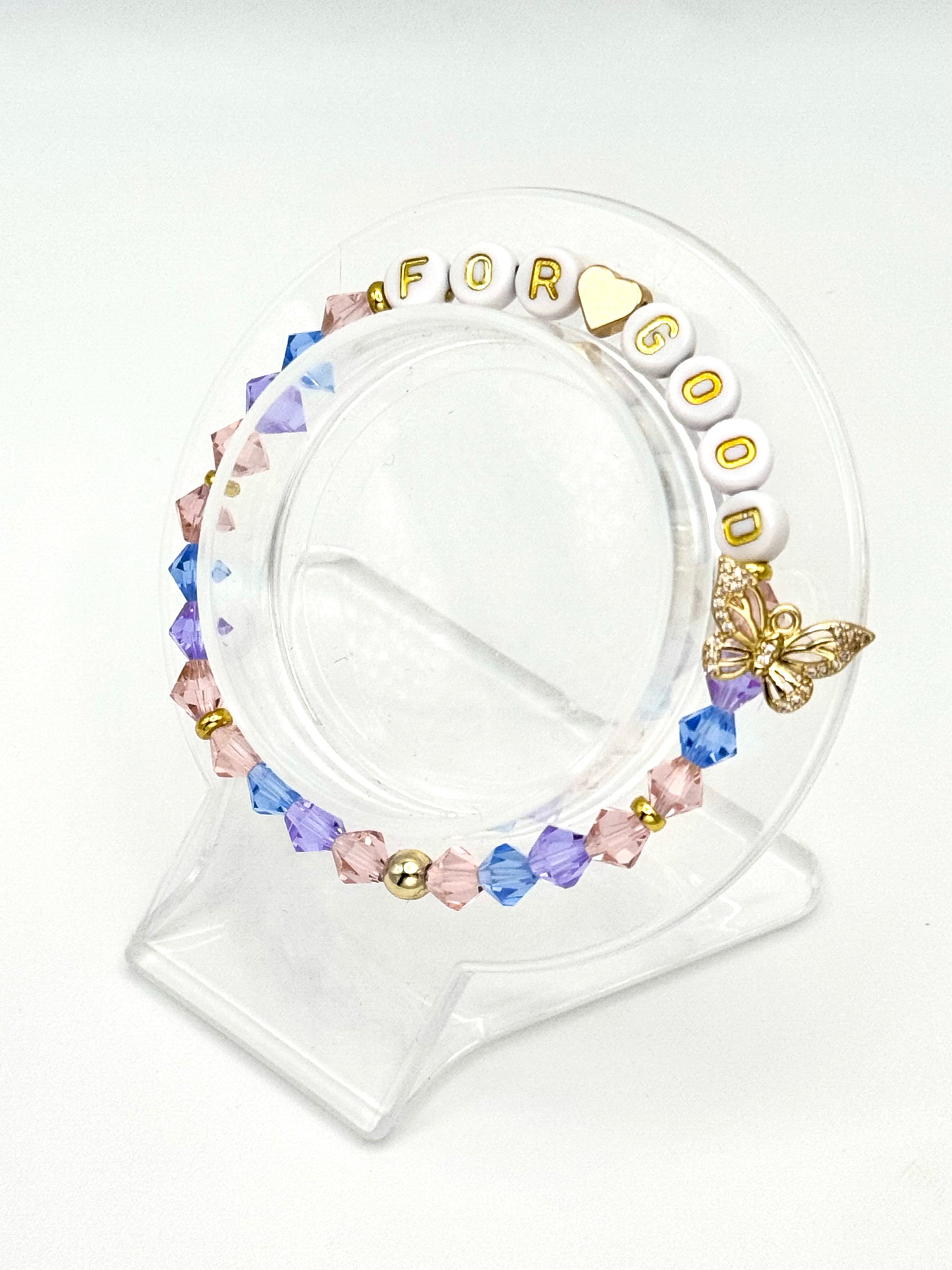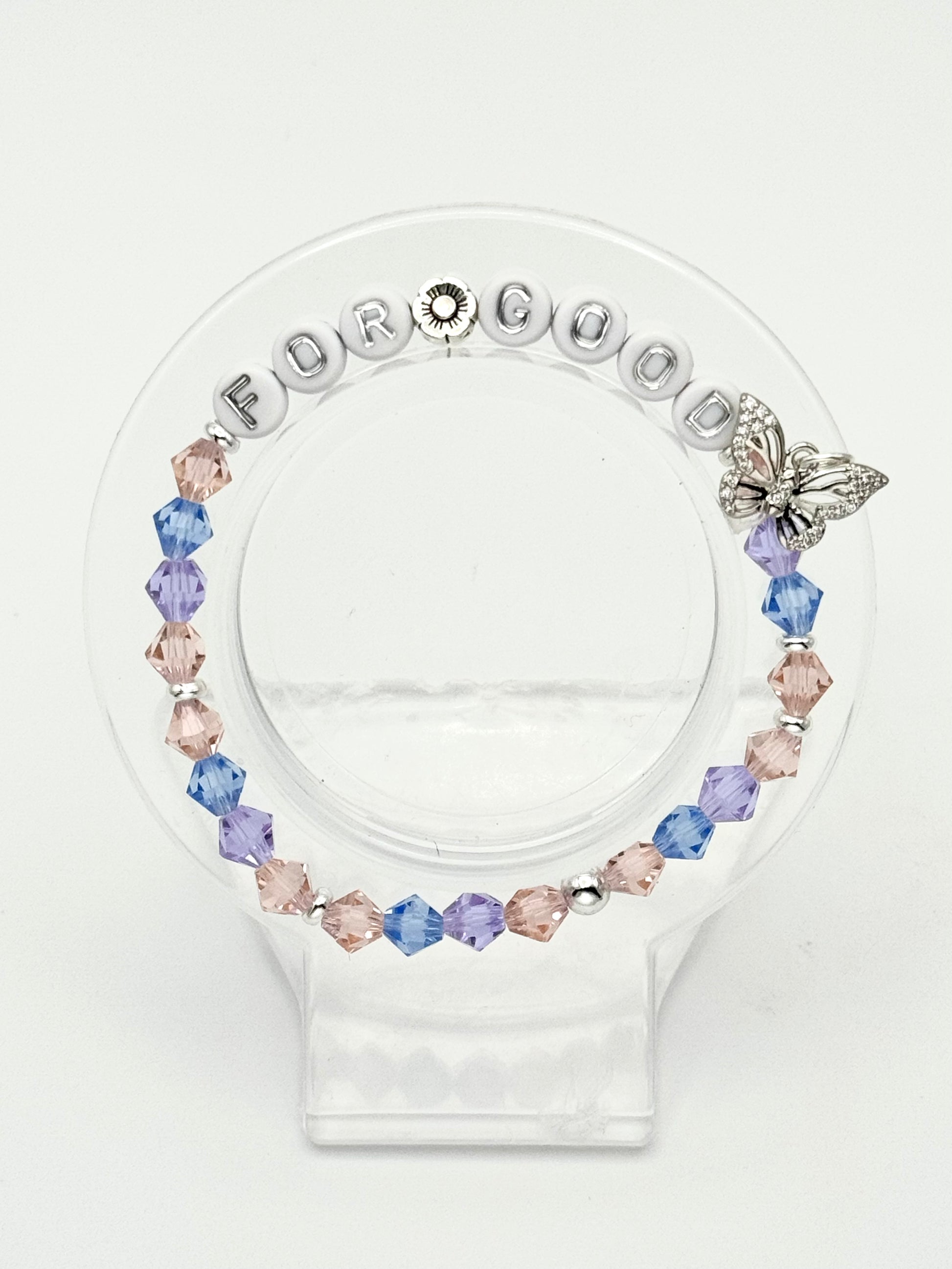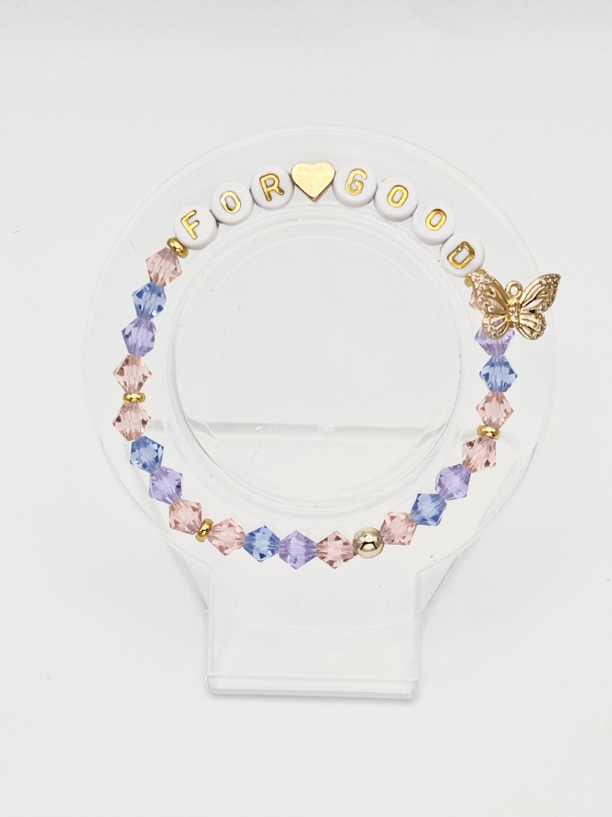 Product Description: Two bracelets, each crafted with pastel top quality crystals in shades of pink, lavender, and sky blue. Finished with a butterfly charm in your choice ofΒ 14k gold or sterling silver, symbolizing change, freedom, and connection across both worlds.